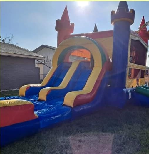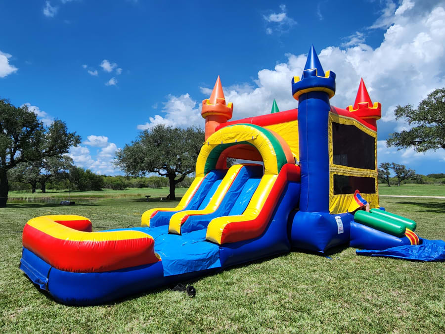 The Rainbow Castle Dual Lane Combo Wet is a little more than just a bounce house. It combines a roomy bounce area with twin wet slides and a splash pool for fast, safe water fun. Ideal for young children who love to race, tumble, and cool off. Perfect for backyard birthday parties, community fundraisers, and corporate family days. Reserve our Rainbow Castle Dual Lane Combo Wet in Alice, Portland, Aransas Pass, Ingleside, Flour Bluff, Corpus Christi, Gregory, Riviera, Kingsville, Calallen.