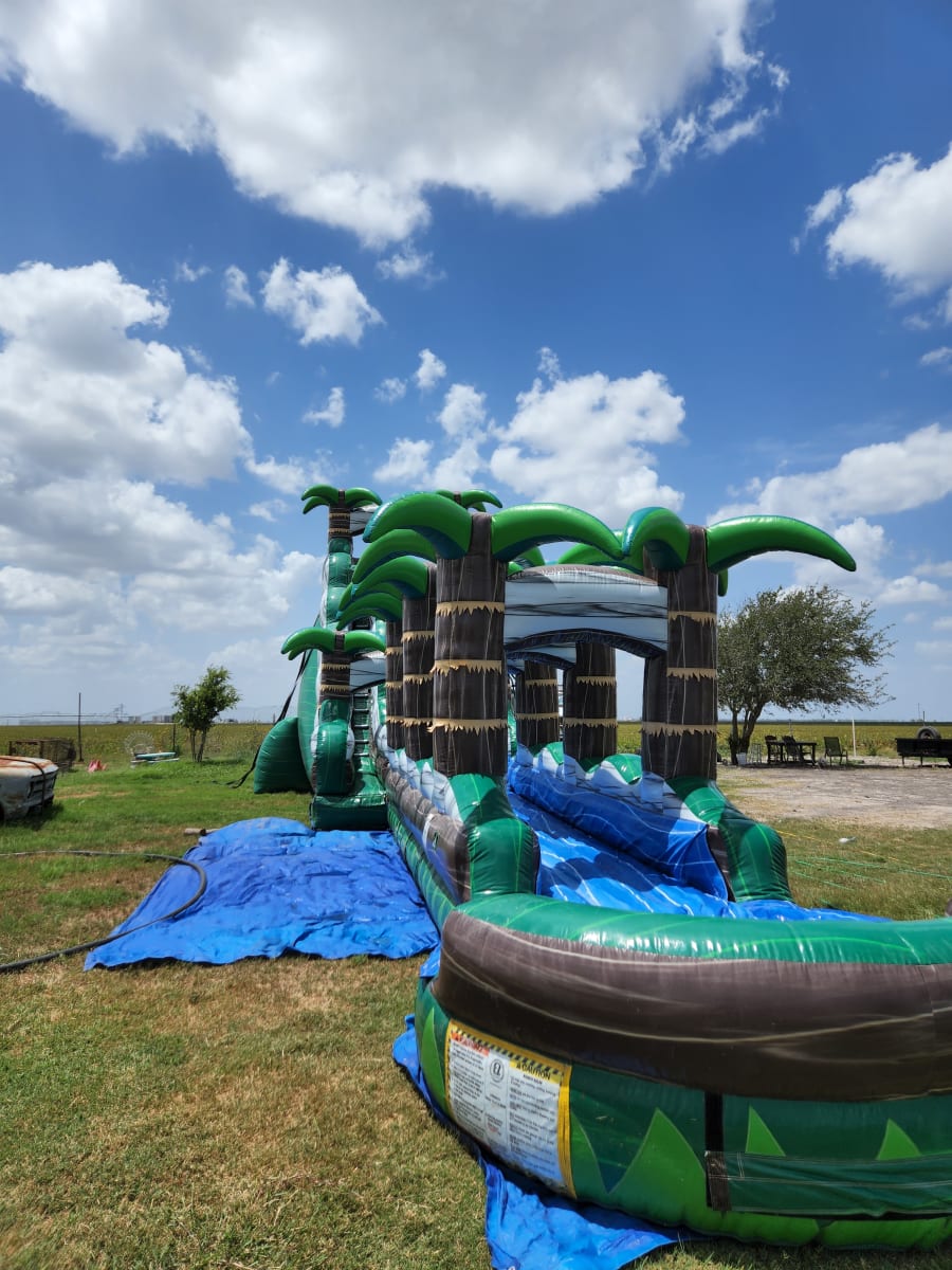 Turn any event into a splashy highlight. This 22 foot Rain Forest single lane water slide with a Slip & Slide delivers big thrills. Safe design. Bright rain forest graphics. Fast, wet fun for kids, teens and adults. Perfect for backyard parties, schools, graduation parties, and birthday parties. 🎉 Perfecto para sus fiesta. Para toda la familia.